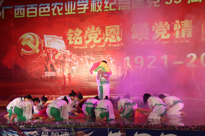 党旗飘扬、党徽闪耀、红歌激昂。昨晚,校园里洋溢着庄严而热烈的气氛,我校”铭党恩、颂党情、跟党走“纪念建党95周年文艺晚会如期举行。校长雷武逵等5位校领导班子与全校师生一起参演并观看演出,党总支书记、校长雷武逵首先代表校领导班子向全体党员致以节日的问候和美好的祝福。