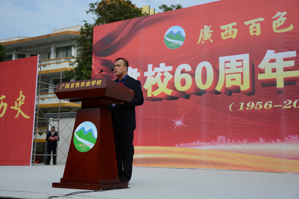 学校党总支书记、校长雷武逵致辞。他深情回顾了学校60年的办学历程。他说广西百色农业学校办学这60年是曲折沧桑、艰苦奋斗、转型发展、改革创新、硕果累累的六十年。虽然两度停办、两迁校址而薪火相传,四易校名但干事创业、拼搏奉献、奋发向上的精神不变。他指出在未来的征程中,学校将以60周年校庆为契机,遵循现代职教规律,以服务“三农”为宗旨,以深化内涵发展为主线,大力实施科学发展、内涵发展、特色发展、创新发展,着力提高人才培养质量,着力提升社会服务水平,在新的历史时代谱写广西百色农业学校新的辉煌篇章!