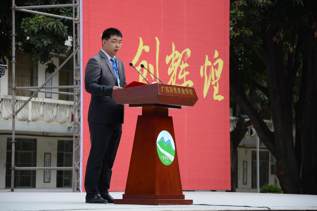 自治区农业厅党组成员、总农艺师王凯学在讲话中首先向全体师生员工、离退休教职工和广大校友表示热烈的祝贺和亲切的问候,随后简要回顾学校近年来所取得的发展成就,特别指出百色农校自1956年创办以来,走过了极不平凡的奋斗历程,在艰苦创业中开拓前进,在励精图治中发展壮大,由一所普通中专学校发展成为一所自治区级重点和自治区示范性中等职业学校,为社会培养了大批专业人才和高素质的劳动者,为我区现代农业发展和新农村建设作出了应有贡献。希望学校以建校六十周年为新的起点,抓住国家和自治区大力发展职业教育的大好机遇,坚持办学特色,努力培育具有工匠精神的技能型人才,推动学校持续、平稳、健康发展。