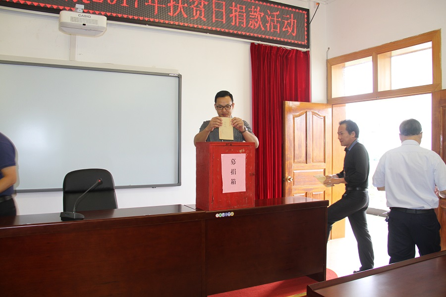 他表示,脱贫攻坚是当前全区乃至全国的重点工作,事关贫困群众福祉的大事,希望学校相关科室(部门)要提高认识,主动与牵头单位对接,做好工作协调联动,做实定点帮扶靖西市禄峒镇思候村呑笃屯扶贫工作,同时他向全体教职工发出捐款倡议,本着自愿原则,希望大家发扬扶贫济困的精神,积极参与到扶贫帮扶活动中,以实际行动为国家扶贫攻坚事业出一份力,尽一份责任。随后,在学校领导带领下,全体教职工积极响应,依次排序,走到捐款箱前,纷纷献上自己爱心。据统计,当天共收到捐赠款5011元。