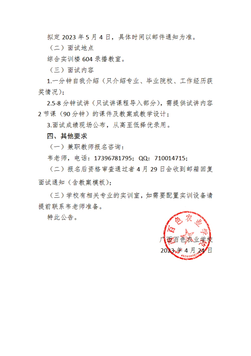 广西百色农业学校2023年春季学期第二批兼职教师招聘公告
